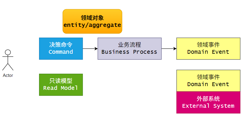 - 黄色 - 领域对象 Entity、Aggregate:角色让领域对象通过决策命令,完成领域事件。